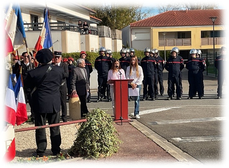 Face aux personnalités et au public venu en nombre, Loreleï et Maïna ont lu un texte sur la création de la tombe du Soldat Inconnu sous l’Arc de Triomphe à Paris. En effet, le bilan de la Grande Guerre est catastrophique et c’est toute une Nation qui est en deuil. Le 9 novembre 1920, un corps est choisi parmi ceux des poilus tombés sur le front de Verdun. Le 11 novembre 1920, le cercueil du soldat inconnu est accompagné en cortège jusqu’à l’Arc de Triomphe. En 1923, la flamme du Souvenir vient compléter cette tombe afin que chacun d’entre nous puisse se souvenir et ne pas oublier les hommes qui sont morts au combat pour notre liberté. Dans le même esprit, la loi du 24 octobre 1922 fait du 11 novembre un jour de commémoration nationale et incite les communes à construire des monuments aux morts ; celui de Soustons est inauguré dès 1922 par le maire de l’époque Emile Nougaro.